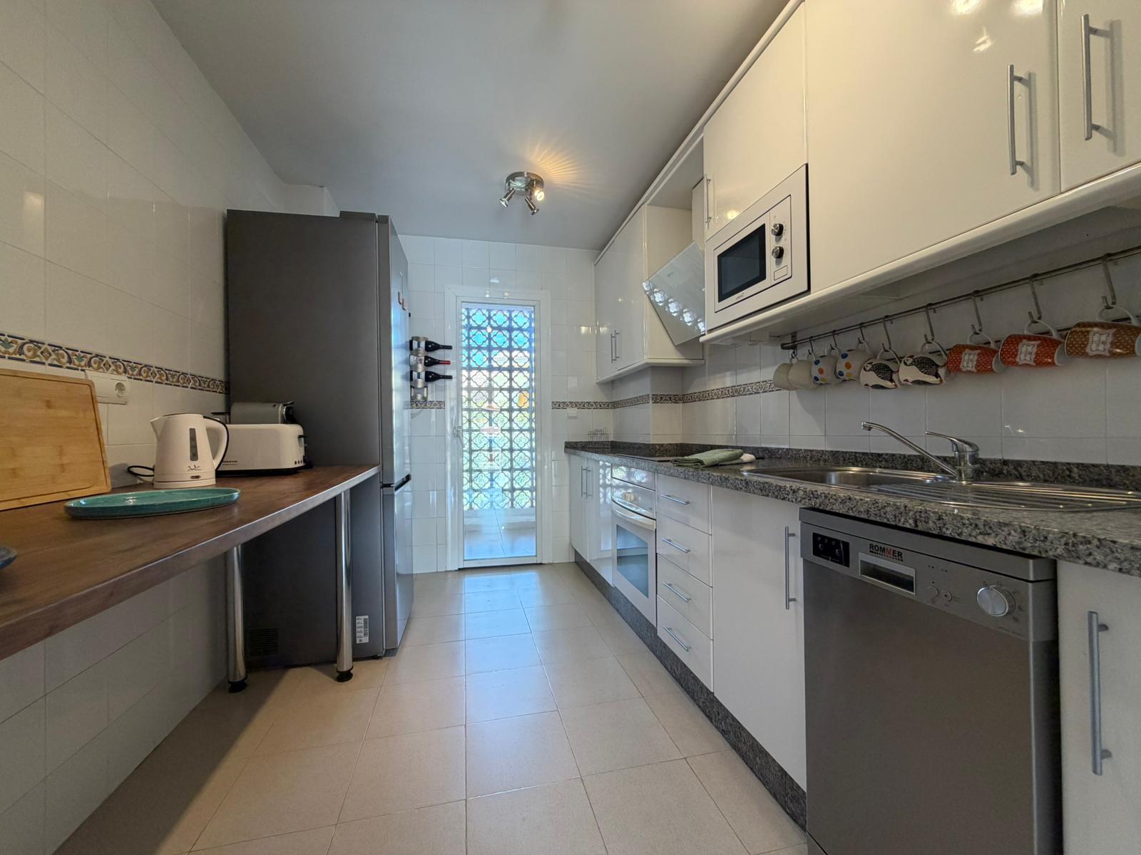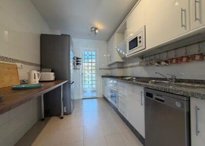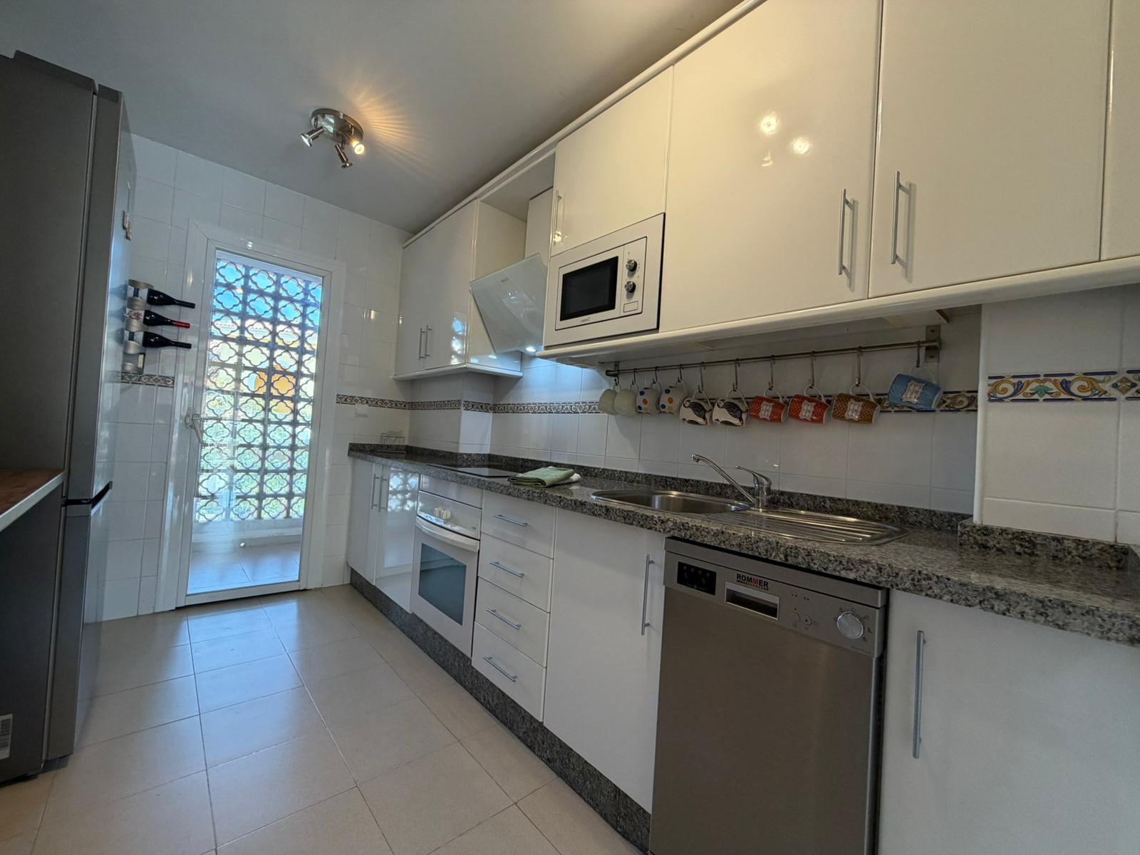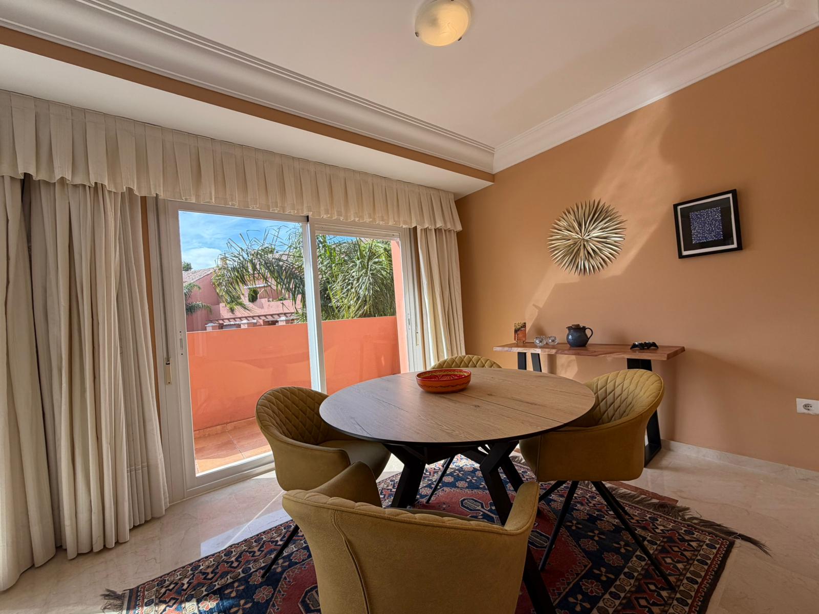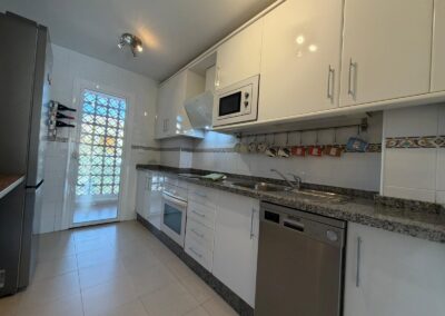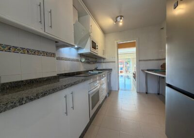 The bright and spacious living room features an open-plan dining area, flooded with natural light from large terrace windows that open directly onto the balcony. From here, you can enjoy views over the landscaped gardens, the communal swimming pool within the urbanisation, and even glimpses of the sea.