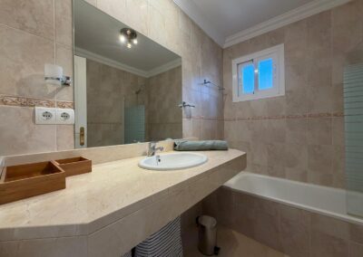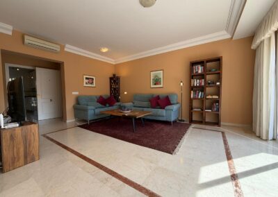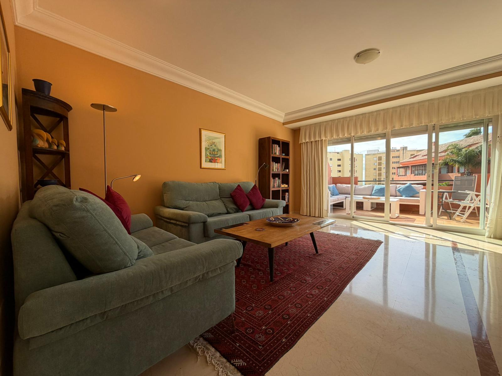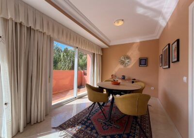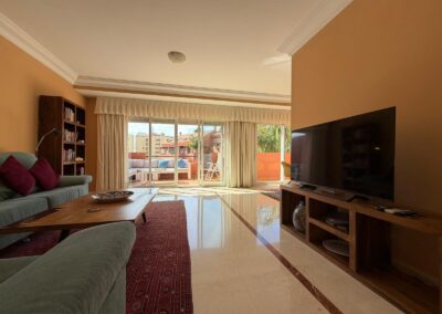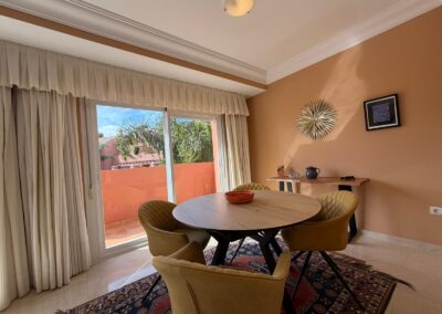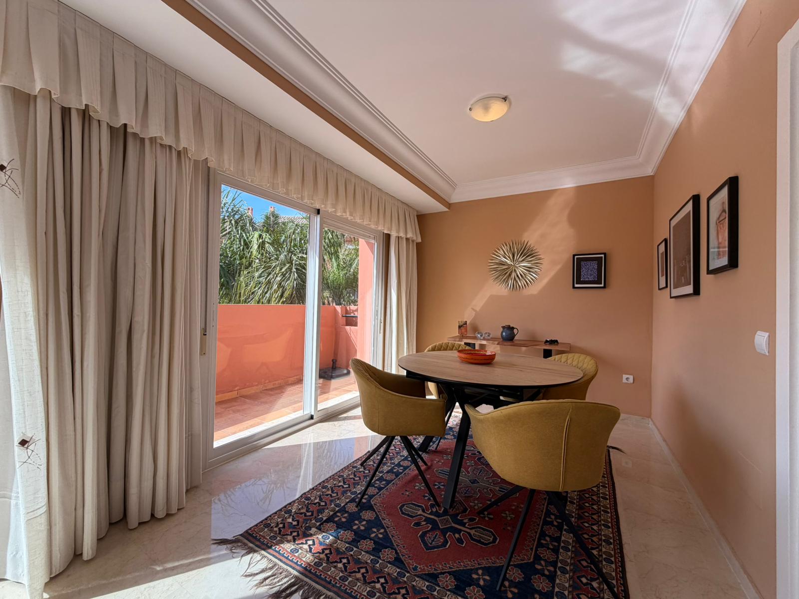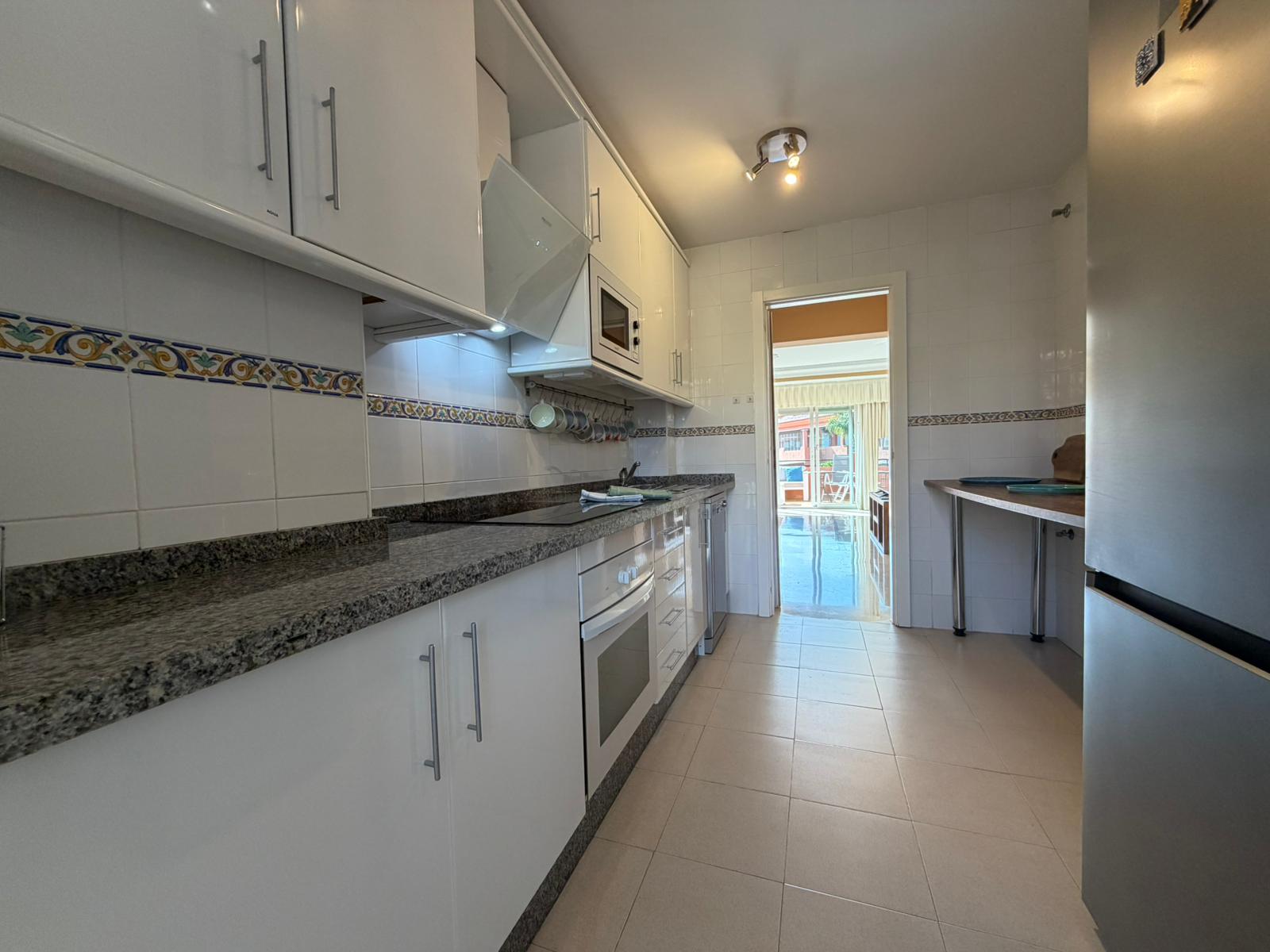 The bright and spacious living room features an open-plan dining area, flooded with natural light from large terrace windows that open directly onto the balcony. From here, you can enjoy views over the landscaped gardens, the communal swimming pool within the urbanisation, and even glimpses of the sea.