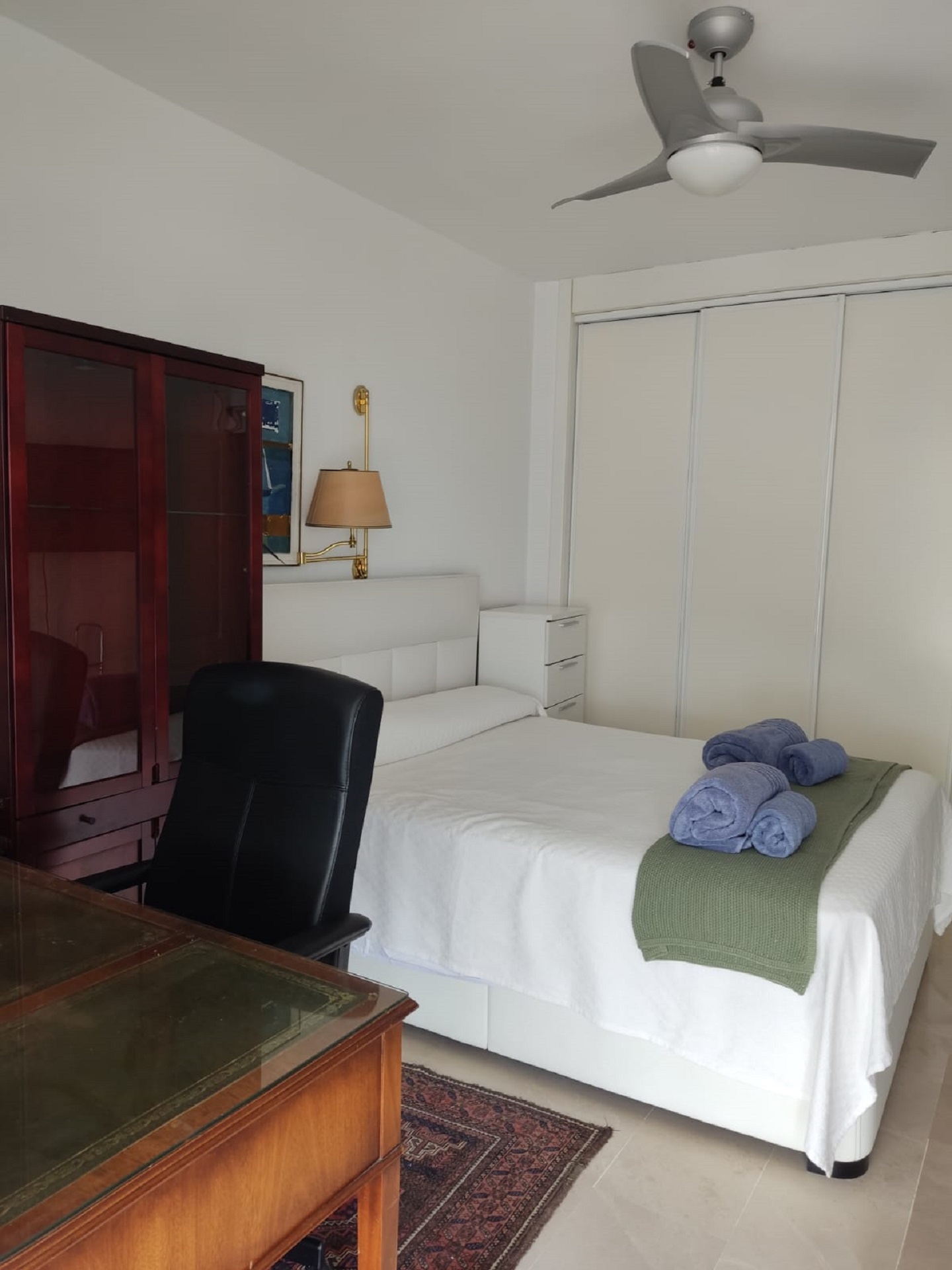 The master bedroom features a double bed and an ensuite bathroom, while the guest bedroom contains 2 single beds and a separate bathroom. 'Cristal' also offers its own private underground parking space with lift access to the apartment. Guests can unwind at the communal swimming pool within the urbanization. It's the perfect holiday setting for relaxation and enjoyment.