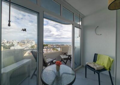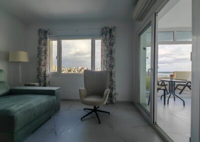 'Surf' is a 1 bedroom apartment, it features a spacious and comfortable lounge area with a large sofa and a flat-screen TV, offering international TV channels. Patio doors from the lounge lead to a partially enclosed terrace boasting amazing views of the marina and mountains.
